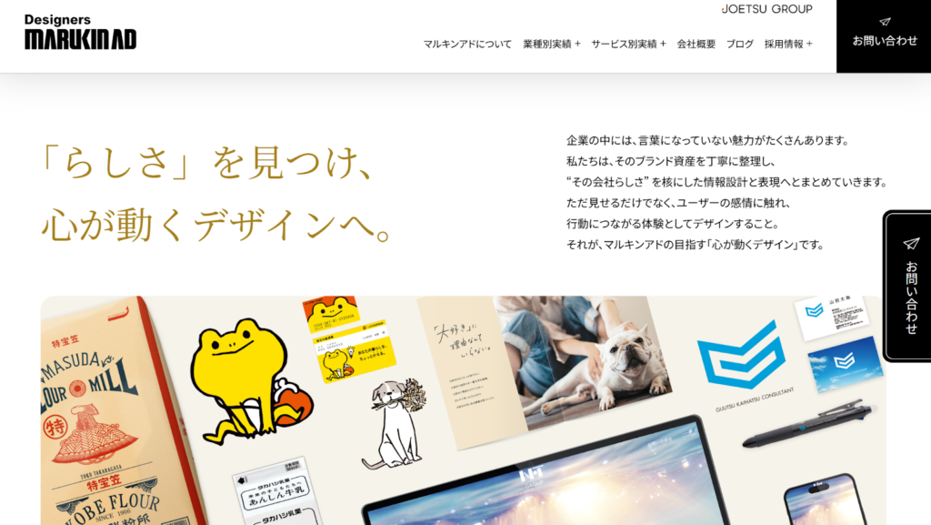 マルキンアド株式会社は、群馬県前橋市を拠点に「心が動くデザイン」を提唱する総合クリエイティブカンパニーです。JOETSUグループの一員として、年間500件以上の豊富な実績を誇ります。企業の潜在的な魅力を掘り起こし、その会社独自の「らしさ」を言語化・視覚化するブランディングを得意としています。